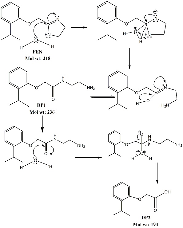 It can be suggested that FEN underwent the same kind of degradation. DP2 had a molecular weight of 194 amu which has a difference of 24 amu from the molecular weight of FEN. It can be suggested that DP1 further undergoes amide hydrolysis to form an acid DP2. Korodi T. et al. have reported a degradation impurity of naphazoline, 1-naphthylacetic acid [26]. This impurity shows a difference of 24 amu from the molecular weight of naphazoline. It can be suggested that FEN could have also undergone the same process leading to formation of DP2. The degradation pathway is depicted in fig. 10.