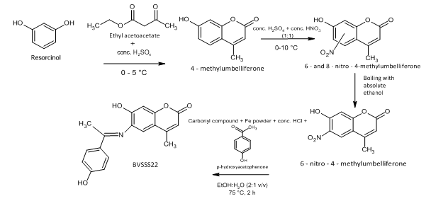 Resorcinol, ethyl acetoacetate (Thermo Fischer Scientific, Bengaluru, India) Silica gel G (Avra Synthesis Pvt. Ltd, India), p-hydroxyacetophenone, dichloromethane (SDFCL, India), iron powder (BFCLAB, India), concentrated sulphuric acid, n-hexane, concentrated nitric acid, ethyl acetate, concentrated hydrochloric acid (SDFCL, India), Ethanol (Labogens Fine Chem Industry, India), digital melting point apparatus (Inlab, India).