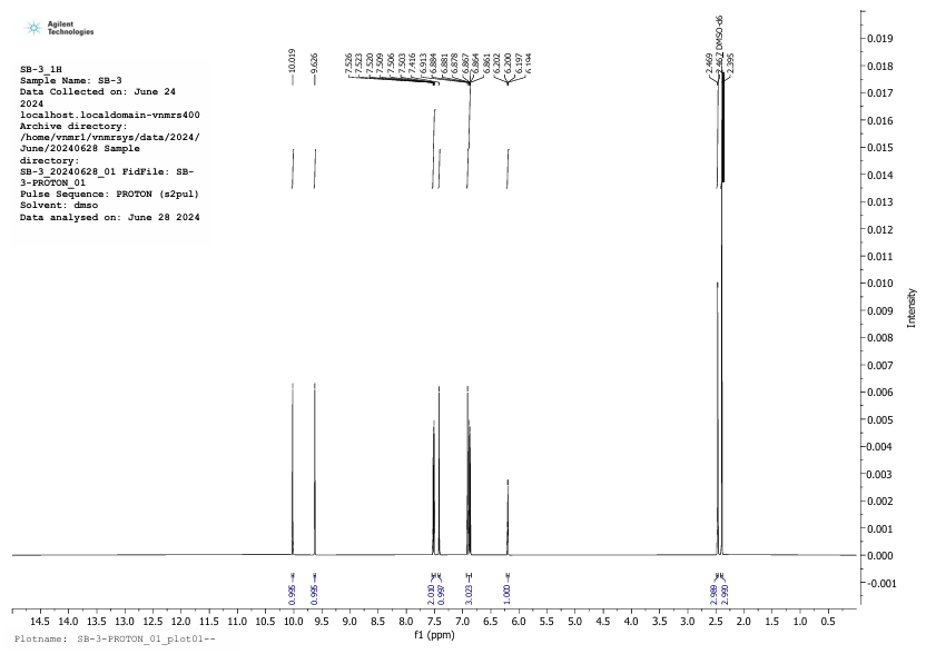 ATR-IR (cm-1) = 3198.19, 3154.24, 2959.78-2853.36, 1740.10, 1666.00, 1535.63, 1518.08; 1H-NMR (DMSO) δ (ppm)= 2.25-2.5 (aromatic CH3, 6H), 6-7.75 (aromatic-H, 6H), near 6.25 (α-pyrone-CH=, 1H), 9.5-10 (phenolic-OH, 2H); HRMS (ES+) (calibrated to M+1): M. W of BVSSS22: 309.32 g/mol; found: 310.107. The spectra are given in fig. 3-5.