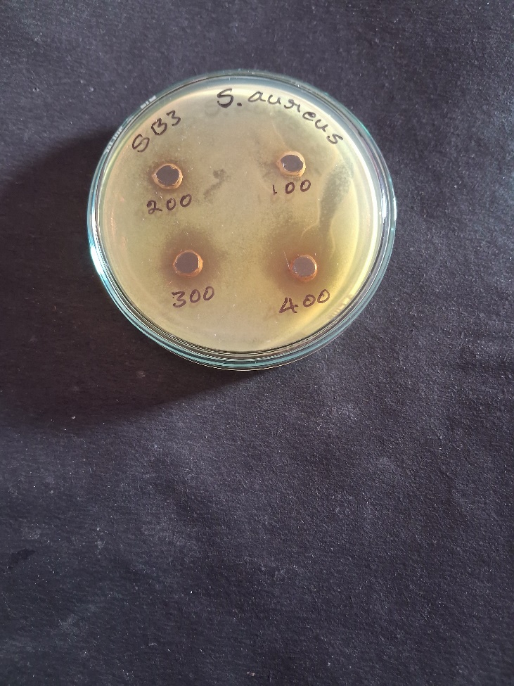 The compounds, BVSSS22 and Trimethoprim (control) were evaluated for antimicrobial activity by agar well diffusion method, as described by Champa et al., 2023 with slight modifications. BVSSS22 and Trimethoprim were tested against the bacterial strain, g-positive S. aureus. The inoculum was adjusted to approximately 5 × 105 CFU/ml with sterile saline solution. Each compound was dissolved in DMSO, and 10 mg/ml solution was made as a stock. From the stock, different solutions of concentrations ranging from 100 µg/ml to 400 µg/ml were prepared. 20 ml Mueller-Hinton agar medium (HiMedia) was poured into each borosilicate Petri plate and allowed to solidify and the inoculum was then added onto the agar.5 mm wells (4 numbers in a plate; 5 numbers including the blank, DMSO (Dimethylsufoxide) were made with an agar borer and sample solutions of different concentrations were loaded into the respectively labelled wells. All plates were placed in an incubator at 37 °C for 12h. After incubation, the diameter of inhibition zone (mm) was measured in triplicates and the mean zone of inhibition at each concentration with standard deviation was calculated [9].