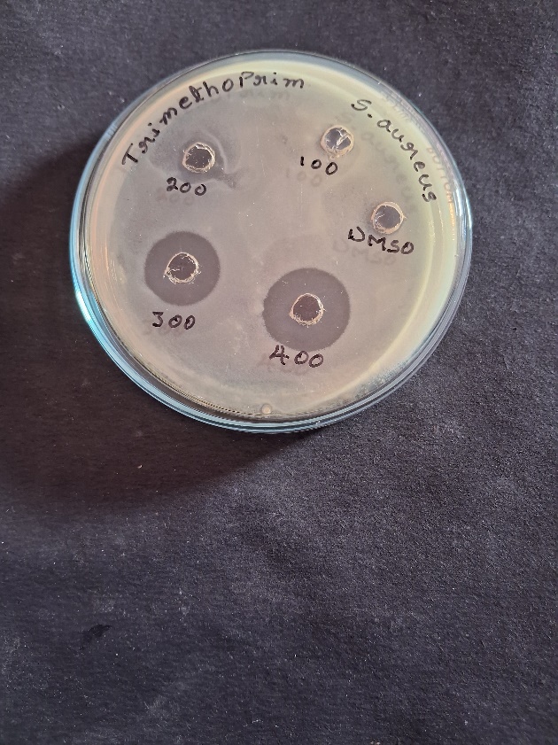 The results of the assay are shown in fig. 3 and table 1. Antibacterial studies were performed using the agar diffusion method for BVSSS22 and the standard Trimethoprim. Staphylococcus aureus was the test microorganism used. The compounds were tested at various concentrations (100, 200, 300 and 400 µg/ml).
