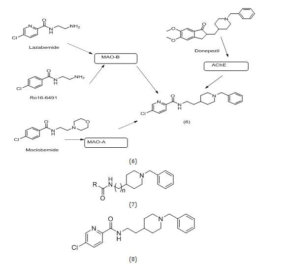 Fan Li et al. synthesized 23 compounds that resemble donepezil that have been discovered to possess potential properties, such as the ability to inhibit both MAOs as well as ChEs [13]. Their plan was to synthesize compounds resembling structure (6) by adding the benzamide component from lazabemide, Ro16-6491, or moclobemide, which have MAOs inhibitory action while retaining the 1-benzylpiperidine fragment from donepezil, which inhibits ChEs [14]. They modified the carbon spacer's length to acquire an alternative conformation that might improve the efficiency of the proposed compounds because the AChE's ability to accommodate the hybrid could be affected by the linker's length [15]. Fan and colleagues synthesized 23 compounds of general formula (7). Out of the synthesized derivatives, compound (8) was found the most potent one.