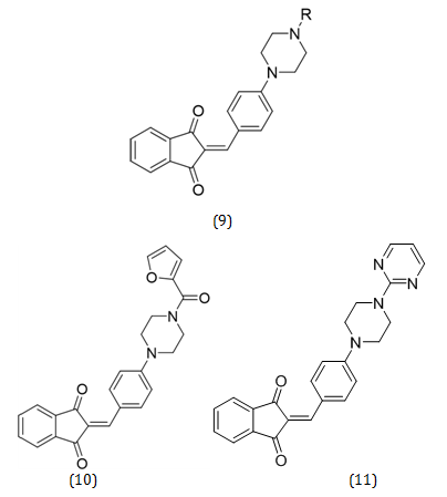A set of 2-(4-(4-substituted piperazin-1-yl) benzylidene)-1H-indene-1,3(2H)-diones were created by Mezeiova et al., which include an indanone moiety, a curcumin fragment, and a piperazine moiety inside of one framework only. Researchers have found that the indanone moiety is crucial in the inhibition of AChEs. The piperazine moiety is also widely employed to show AChE inhibition, neuroprotection as well as antioxidant properties, and curcumin showed promising Aβ aggregation inhibition activity[16]. Out of the total 11 compounds synthesized (general formula 9), Compounds 10 and 11 demonstrated strong inhibition against AChE and looked to be the most active multifactorial agents among all synthesized compounds (IC50= 0.048 μM: 5; 0.036 μM: 6) [17].