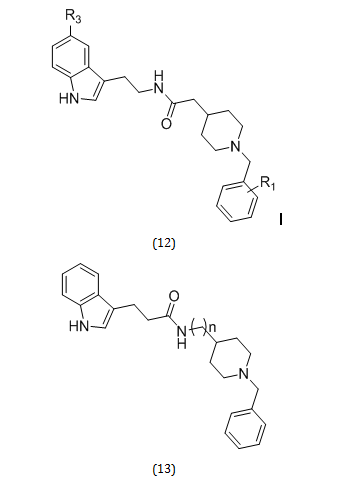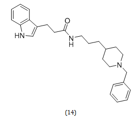 Xiao-Bing Wang et al. developed a novel class of drugs for the treatment of AD by combining the antioxidant melatonin with the AChE inhibitor donepezil. Wang and colleagues synthesized 21 such hybrid compounds (general structures 12 and 13). Among them compound (14) has shown the maximum inhibition activity (IC50 value of 193 nM for eel AChE). The outcomes strongly suggested that the hybridization approach is a successful strategy for identifying novel scaffolds with desirable bioactivities [19].