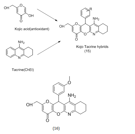 Multitarget small molecules (MTSM) represent the most effective and alluring therapeutic method to develop new therapeutics forthe therapy of AD, in light of the multifunctional nature of disease. Youssef Dgachia et al. designed, synthesized and biologically evaluated Kojo Tacrines (KTs) by combining certain pharmacophoric motifs from tacrine and kojic acid. Tacrine was the first AChE Inhibitor (AChEI) for AD therapy to be commercially available and approved, but it was quickly withdrawn due to hepatotoxicity [20, 21]. Despite this, the development of novel non-hepatotoxic analogues for AD has mainly followed the tacrine model. A known antioxidant, KA, is a naturally occurring metabolite of fungi [18]. 12 novel kojotacrines (KTs) having (general structure15) were developed, synthesized, and tested as potential cholinesterase inhibitors (ChEIs) augmented with antioxidant characteristics after taking into account KA's capacity to scavenge reactive oxygen species. The hit agent (16) was found to be less hepatotoxic than tacrine [22].