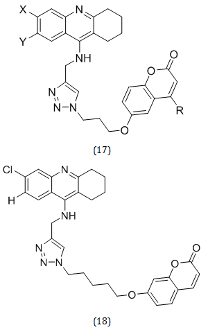 Tahmineh Akbarzadeh et al. created, synthesized, and evaluated a new class of tacrine-coumarin hybrids (17) connected to 1, 2, 3-triazole as powerful dual binding site cholinesterase inhibitors (ChEIs) for the treatment of AD. The strongest anti-AChE activity was shown by compound 18 (IC50= 0.027 μM). These brand-new tacrine-coumarin hybrids might be useful therapeutically in the treatment of AD in the future [23, 24].