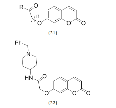 Abbas Shaifee et al. synthesized a series of 7-hydroxycoumarins of general formula (21) as potent anti-cholinesterase agents. The Compound (22) was found to be the most potential agent against AD [30].