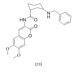 A series of 3-substituted coumarin, most of which were embellished with methoxy groups at positions 6 and 7, were designed, created, and tested as cholinesterase inhibitors by M. Catto et al. AChE inhibitory action was somewhat high in 6,7-dimethoxycoumarin derivatives with a benzyl amino group attached to position 3 by appropriate linkers. The spacer's length, shape, and methoxy substituents on the coumarin scaffold all had a significant impact on the inhibitory activity. The compound (23) was found to be the most active molecule (IC50 7.6 nM)[31].