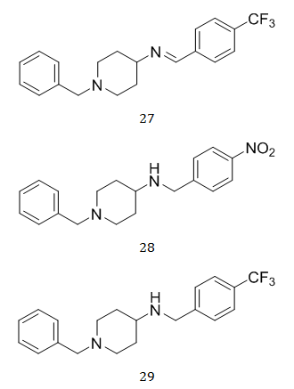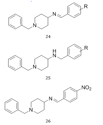 The most effective AChE inhibitor, donepezil, has an N-benzylpiperidine nucleus, which acts as a good AChE inhibitor. The research also argues in favour of altering another terminal component (the indanone nucleus), which would increase BACE-1's inhibitory capability[32]. Researchers suggest that ligands with an N-benzylpiperidine nucleus may have the ability to inhibit AChE and BACE-1 in a variety of ways based on the several findings. Sushant Kumar Shrivastava et al. developed and created a pool of N-benzylpiperidine analogs (24, 25) as multifunctional inhibitors of both AChE as well asβ-secretase-1 (BACE-1) with good to exceptional inhibitory activity. Additionally, the two most promising medicines, 26, 27, 28 and 29 improved cognitive impairment in AD rat models [33].