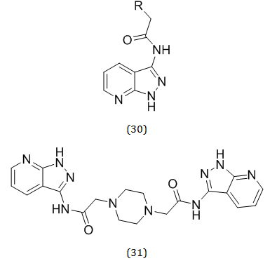 The pyridine moiety is more frequently found in numerous natural goods and pharmaceutically active substances than other heterocyclic compounds [34]. Additionally, efforts have been made to create pyridine scaffolds that can be used to treat AD [35]. The 4-amino-5-carboxylates of pyrazolo pyridines (Etazolate) is an anxiolytic drug that has also been known for its neuroprotective nature. A group of drugs from this scaffold; Tracazolate, Etazolate, LASSBio-872, LASSBio-873, LASSBio-981, and LASSBio-982 have been used to treat anxiety disorder related with GABA induced neuro-inhibition [36]. T. Umar et al. developed a series of potent neuroprotective agents against AD derived from pyrazolopyridine and evaluated their biological activities. 2-(piperazin-1-yl)-N-pyrazolo pyridine acetamides (30) are referred to as a new category of powerful AChEI as well as inhibitors of Aβ-aggregation. All compounds were evaluated for their acetylcholinesterase inhibitory activity. Out of 9 synthesized derivatives, compound (31) showed maximum activity. The derivative with the highest anti-AChE activity was the strongest one. (IC50 = 4.8 nM) [37].