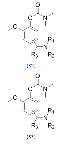 While searching for novel anti –Alzheimer agents, Rong Sheng et al. studied newer MTDLs with the natural neuroprotectant curcumin and the AChE/Butyryl Cholinesterase (BuChE) inhibitor rivastigmine [38]. The FDA has recognized rivastigmine as the only carbamate AChEI [39]. A popular natural compound called curcumin has a number of biological activities along with neuroprotective qualities [40]. Rong Sheng et al. developed, produced, and assessed a number of newer carbamate compounds (32) which may act as better agents in management of multifactorial AD. The majority of them demonstrated well to exceptional AChE and BuChE inhibitory actions. With an IC50 value of 0.097l μM, compound (33) showed the strongest AChEI among all the substances [41].