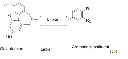 An alkaloid called galantamine (GAL) has been found in the bulbs and blooms of Leucojum aestivum L. and Galanthus species. It is one of the approved drugs FDA permitted for the treatment of AD and is an AChE inhibitor. It is also identified as the allosteric nicotinic acetylcholine receptor (nAChR) modulator [42]. Both outcomes enhance the brain's thinking capacity. A naturally occurring polyphenolic substance called curcumin (CU) was discovered in the rhizomes of Curcuma longa L. p. Aβ-oligomers and fibrils are bound by CU, which prevents the production of β-sheets [43]. A series of GAL-CU hybrids (34) with promising anti-amyloid aggregation activity were developed by Georgi Stavrakov et al. as dual-site binding AChE inhibitors. The neurotox.icity and anti-AChE activity of the best 10 compounds was produced and assessed in vitro. Five of them exhibited activities between 41 and 186 times higher than GAL and were found less harmful than GAL and CU [44].
