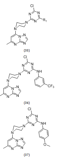 The manufacturing of antiviral antifungal, antimalarial, antibacterial, and anticancer medicines has a long history with the 1, 3, 5-triazine scaffold. Triazine has a generally planar structure; therefore, it was predicted that it would favour the Aβ disaggregation. Triazolopyrimidine nucleus was anticipated to interact with key residues on AChE's PAS, perhaps improving the capacity of medicinal molecules to inhibit the enzyme. Triazole scaffold has, in fact, been successfully used in the creation of multifunctional AChEIs [45]. A pool of triazine-triazolopyrimidine hybrids (35) were developed and synthesized in an effort to discover powerful MTDL for the treatment of AD in light of all these findings by Ehtesham Jameela, Poonam Meena, and colleagues [46]. Out of these compounds, (36 and 37) showed good AChE inhibitory activity (IC50 values 0.065 and 0.092μM respectively).