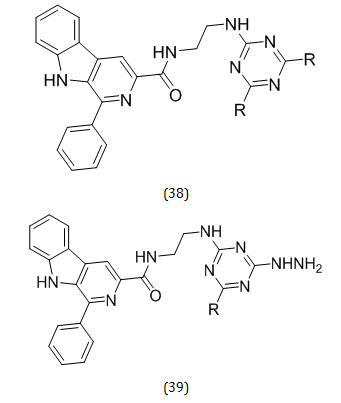 Potential cholinesterase inhibitors were described across numerous types of heterocyclic compounds, including those with the 1, 3, 5-triazine and β-carboline nuclei. β-Carboline derivatives demonstrated activity in neurological conditions linked to AD, serving as strong AChE and BuChE inhibitors [47]. A series of compounds (38) were created by Helena Sarragiotto and colleagues, who then tested their in vitro activity against AChE. The compound with the highest potency (39) showed the (IC50 values 7.6 μM) [48].