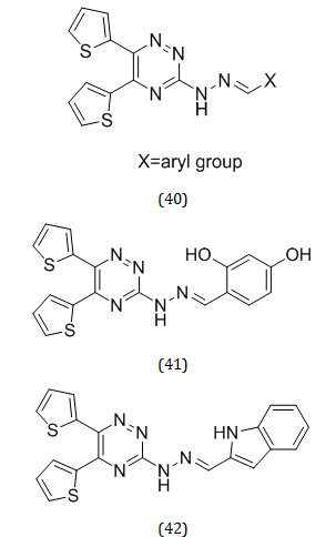 Numerous tiny hydrazinyl—triazine compoundswere identified as BACE-1 inhibitors in the researcher’s investigation. Najmeh Edraki created a triazine-thiophen skeleton with imide linkers and a suitable aryl pendant as the core structure. The biological activities of fifteen compounds (40), including β-Site Amyloid Precursor Protein Cleaving Enzyme 1 (BACE1) inhibition, antioxidant activity, and metal chelating potential, were studied. Using a FRET-based assay, the biological screening findings showed that the majority of our compounds exhibited strong inhibitory effects against (BACE1). Significant BACE-1 inhibitor characteristics were discovered for compounds (41) and (42), with IC50 values of 0.91μM and 0.69μ M, respectively [49].