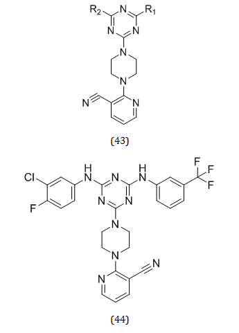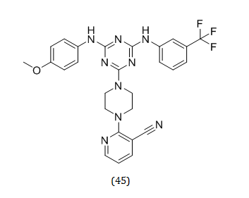 Triazine scaffold has long been used by medicinal chemists in the creation of pharmaceuticals [50, 51]. Eight novel cyanopyridine-triazine hybrids (43) were created by Manisha Tiwari et al. as effective multifunctional AD therapy agents. All of the synthetic compounds were tested for their ability to inhibit cholinesterases and their ability to prevent Aβ from aggregating. Compounds (44 and 45) demonstrated strong inhibitory action against AChE among the produced derivatives, with IC50 values of 0.059 and 0.080 μM, respectively [52].