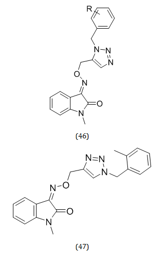 It has recently been demonstrated that 1, 2, 3-triazole isoindoline has potent neuroprotective properties and effective BACE-1 inhibition. The heterocyclic molecule benzoyl 1,2,3-triazole and its derivatives, which have a strong dipole moment and the ability to make hydrogen bond interactions with the active site, are significant [53]. As cholinesterase inhibitors, this primary scaffold is frequently used as a therapeutic possibility for the treatment of AD [54]. Seyedeh Sara Mirfazli et al. successfully synthesized and tested a pool of 1, 2, 3-triazole-methylindolinone derivatives (46) for their AChEI efficiency. Compound (47)was shown to have an anti-BuChE IC 50 value of 4.78 μM, making it more powerful than the benchmark medication donepezil (5.19 μM)[55].