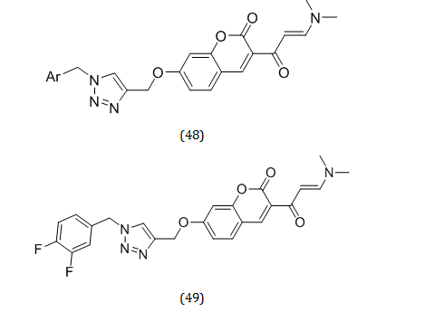 On the basis of the multi-target-directed ligands strategy, newer 1, 2, 3-triazolechromenone compounds (48) were produced by Karimi Askarani et al. with the goal of discovering novel anti-Alzheimer MTDL agents. Inhibition of AChE and BuChE, aggregation of β-amyloid, and neuroprotective properties were among the in vitro biological activities conducted. The findings showed a highly selective BuChE inhibitory action, with compound (49) being the most effective, with an IC50 value of 21.71 Μm [57, 58].