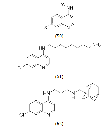 Anita Bosak et al. synthesized some 4-aminoquinoline derivatives (50) with different groups attached to the C (4) and C (7) position. These compounds were evaluated for their activity as human AChE as well as BuChE inhibitors. Out of the 8 Compounds synthesized, two compounds 51 and 52 were found possessing the ability for further modification and the modified compounds may act as workable anti Alzheimer’s agents [65].