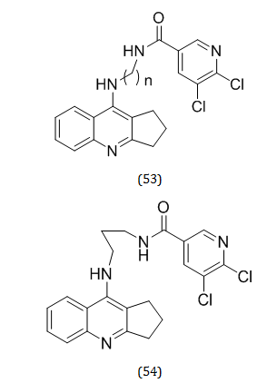 Kamila Czarnecka et al. synthesized some new cyclopentaquinoline hybrids (53) of general formula (4) having effectiveness against AD. The study consists of the synthesis of few quinoline derivatives with substituted nicotinic acid and appropriate linkers. Compound (54) was found to be the most potent acetylcholinesterase inhibitor [66].
