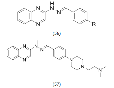 Ulviye Acarevik and colleagues created different substituted quinoxaline-hydrazone compounds (56) and looked into their in vitro activities, including their ability to inhibit MAOA/B and AChE/BuChE. In accordance with the findings of the experiments, substance (57) had good inhibitory efficacy on AChE (IC50 = 0.028μ M) and monoamine oxidase B (IC50 = 0.046 μM)[72].