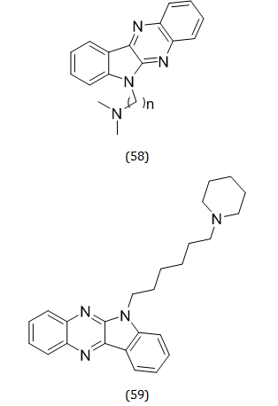 A. M. Kanhed et al. developed a pool of indoloquinoxaline derivatives (58) in the quest to produce multitarget-directed ligands for AD. All of the synthesized derivatives exhibited moderate to good cholinesterase inhibitory activity, according to in vitro studies. The most effective and selective BuChE inhibitor was found to be the quinoxaline derivative(59) (IC50 14 0.96 μM) [73].