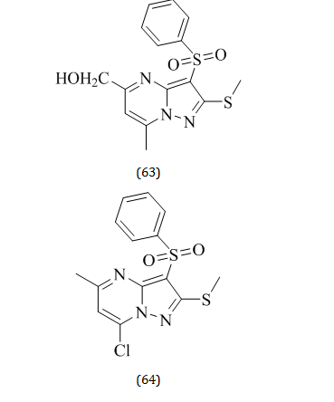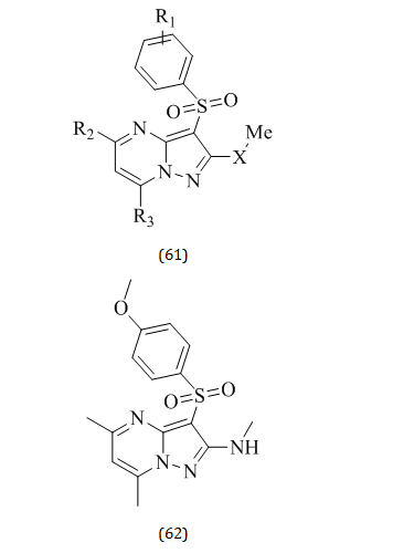 Alexandre V. Ivachtchenko and Elena S. Golovina synthesized a series of new 3-sulfonyl-pyrazolo pyrimidine compounds having general structure (61), and studied the structural–activity relationship of thus synthesized compounds. In his research, Researchers looked for highly powerful 5-HT6R antagonists and found that 62,63 and 64are the most potent 5-HT6 receptor antagonists [80].
