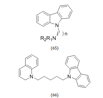 Mehdi Khoobi and colleagues created a number of compounds (65), which were then tested as cholinesterase inhibitors. These compounds contained the carbazole backbone connected to benzyl piperazine, benzyl piperidine, pyridine, quinoline, or isoquinoline moiety through an aliphatic linker. The most effective molecule against AChE was compound (66), which also demonstrated good inhibitory effectiveness for self-and AChE-induced Aβ aggregation [89].