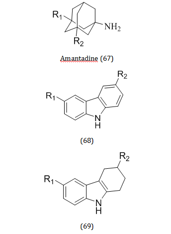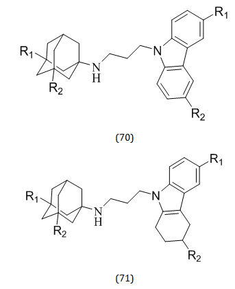 It is well known that carbazoles and tetrahydro carbazoles exhibit a variety of biological activities. Numerous artificial and naturally occurring physiologically active chemicals share the carbazole skeleton as their primary structural motif. Recent years have seen the discovery of interesting molecules among carbazole derivatives for the design of disease-modifying medicines for the treatment of AD [90]. Sergey O. Bachurin created and studied a new class of substances like amino adamantane (67), carbazole (68), tetrahydro carbazole (69) etc. The conjugates of amino adamantane and carbazole derivatives (70) that show promise for the construction of novel multitarget therapeutic medicines for management of neurodegenerative illnesses. First of all, these substances selectively inhibit BuChE and have the ability to prevent nerve cells from dying under conditions of calcium overload. Of all studies, the leading chemical (71) has displayed the most promising results [91].
