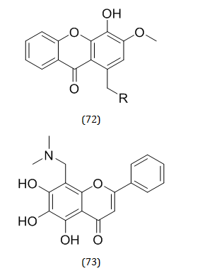 The biological assessment and synthesis of xanthone and flavone derivatives (72) with concurrent antioxidant and AChE inhibitory activity are described by Inês Cruz et al. The Mannich base (73) showed the ability to inhibit AChE as well as antioxidant properties, exerting dual action [97].