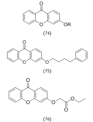 The type of substituents and their placements on the two phenyl rings that make up the core structure of xanthones, in particular, affect the biological activities of xanthones [98-101]. However, xanthones derived from natural resources are time-consuming to extract and purify and have a restricted range of substituents available on the rings [102]. In order to produce different xanthone derivatives, structural alteration of the xanthone-based skeleton is desirable [103]. Twenty-nine novel xanthone derivatives (74) were synthesized using ether, ester, hydroxyl, alkyl, alkenyl, alkynyl, and five other types of side chains by Z. H. Loh et al. The researchers further evaluated the synthesized compounds for their anti-cholinergic activities against both the ChEs. Out of synthesized derivatives, compounds (75 and 76) showed maximum activity [104].