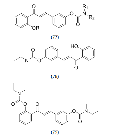 Small molecule with an unsaturated carbonyl group known as chalcone [(E)-1,3-diphenyl-2-propen-1-one] is a precursor or constituent of numerous naturally occurring flavonoids and isoflavonoids [105, 106]. In medicinal chemistry, it is one of the most privileged structures. Numerous medicinal chemists are studying this scaffold because of its vast spectrum of biological functions and the potential benefits it may have for treating neurodegenerative illnesses like AD [107]. The therapy of AD might benefit from the biological activities of chalcone compounds, which include anti-inflammatory, MAO-B inhibition, radical-scavenging, and neuroprotective effects [108]. Chalcone compounds are important secondary-metabolite precursors of flavonoids and isoflavonoids [109–111]. Using the multitarget-directed ligands approach, a series of chalcone-rivastigmine hybrids or chalcone-O-carbamate derivatives (77) were created with the goal of discovering multifunctional medicines for the treatment of AD. AChE/BuChE inhibition activity was assessed as in vitro biological activities. With IC50 values of 3.1 M and 1.2 M, respectively, compounds (78) and (79) demonstrated highly selective BuChE inhibitory action [112].