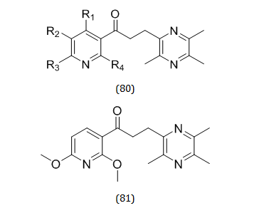 Syed Nasir Abbas Bukharie and colleagues synthesized a number of novel ligustrazine-based chalcones (80). A novel ligustrazine-based aldehyde was created to introduce tetramethylpyrazine (TMP) into the chemical structure of chalcone. For the incorporation of quinazolin-4-yl and pyrazin-2-yl amino moieties, new ketones were created. For AChE, BuChE, and MAO inhibitory activity, the recently synthesized compounds were tested. Compound (81) demonstrated the greatest activity and efficacy on a number of targets among the synthetic derivatives [113].