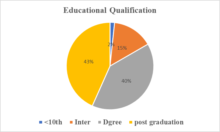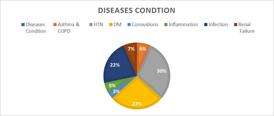During the study period, a total of 95 were approached to recruit in the study based on inclusion criteria only 60 participants agreed to participate in the study. The participants’ details, such as demographic profile, educational qualification, and medical history, were shown in table 1 and fig. 1 and 2. Among them, male were 51.60% and female were 48.30%. Participant’s age was in a range from 21–60 y age and the majority were 51-60 y and least were between 21-30 y age group. Most of the participants were suffering from chronic illness, such as 30% with hypertension. 26.6% with diabetes mellitus, 21.60% with infections and followed by other illnesses like asthma and COPD, renal failure, inflammation and convulsions that are shown in fig. 1. Educational qualification of the study participants were less than 10th class are only 2% and remaining all are above 10th class that includes 40% postgraduation, 43% graduation, and15% intermediate, shown in the fig. 2.