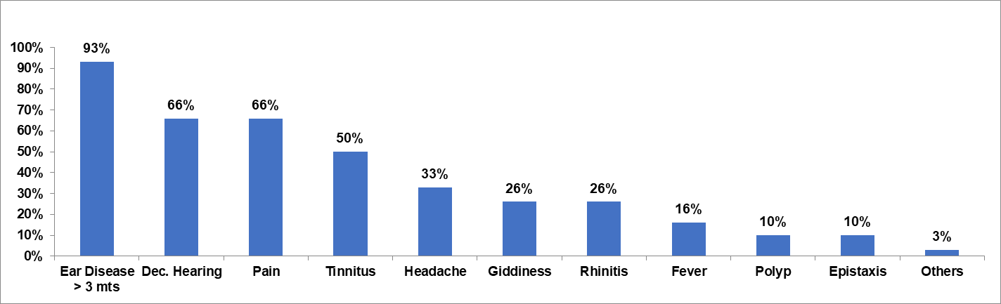 The most common presenting complaint was ear discharge for more than 3 mo in 93% of cases followed by decreased hearing in 66% (fig. 1). Upper respiratory tract infection was noted in 33% of cases and allergic history was noted in 30% of cases. 26% of cases had a history of Modified Radical Mastoidectomy with tympanoplasty (table 3). Tonsillitis and Deviation of Nasal Septum (DNS) were noted in 20% of patients each. Tuberculosis and adenoids were seen in 4% and 2% of cases respectively (fig. 1, table 3).