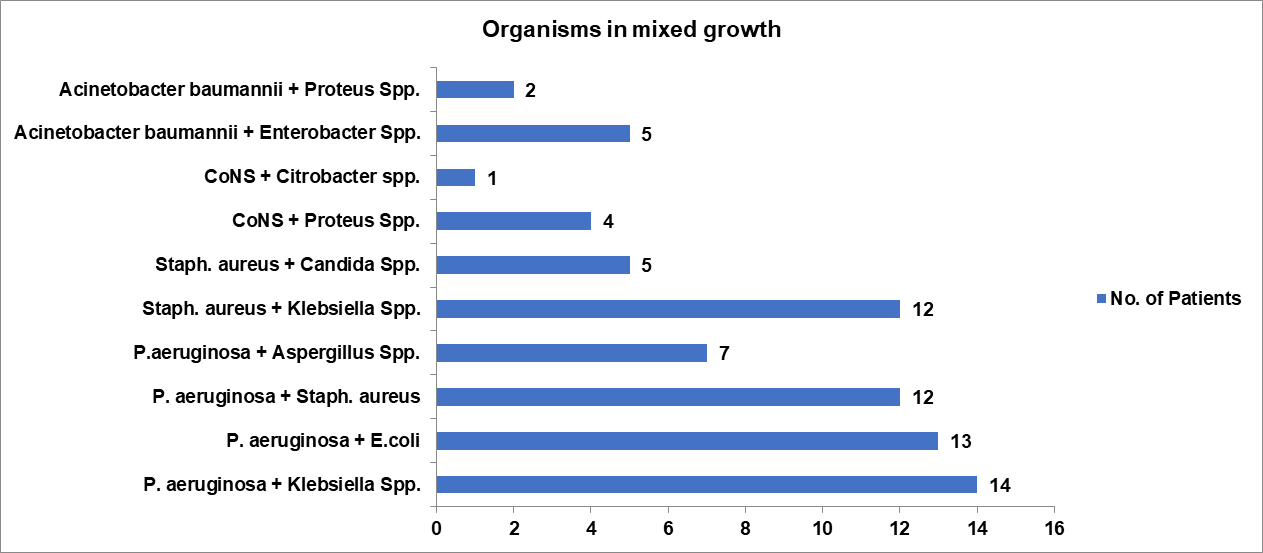 Results: A total of 500 patients were included in the study, with 62.8% being males. The most common organism isolated was Pseudomonas aeruginosa. Fungi accounted for 30 isolates (5%) and anaerobes were 5 isolates (1%). Gram-negative bacteria were found to be most sensitive to Piperacillin-tazobactam (96%) while the highest resistance was noted to Amoxicillin-clavulanate (65%). 100% of Staphylococcus aureus isolates were sensitive to Vancomycin, Linezolid, and Teichoplanin.13% of S. aureus were found to be Cefoxitin resistant (MRSA). The highest resistance in S. aureus isolates was noted to Ciprofloxacin (65%).13% of isolates of Gram-negative bacteria had ESBL production while Amp C β-Lactamase production was noted in 9% of isolates. Out of 186 isolates tested for biofilm production, 149 isolates (80%) showed biofilm production. A total of 30 fungal isolates were obtained in culture. Aspergillus spp. Accounted for 66.6% of fungal isolates while Candida spp. accounted for 33.3% of fungal isolates. The sensitivity of Candida isolates was tested to Fluconazole, Itraconazole, Voriconazole, and Flucytosine and they were found to be 100% sensitive to all the antifungals tested.