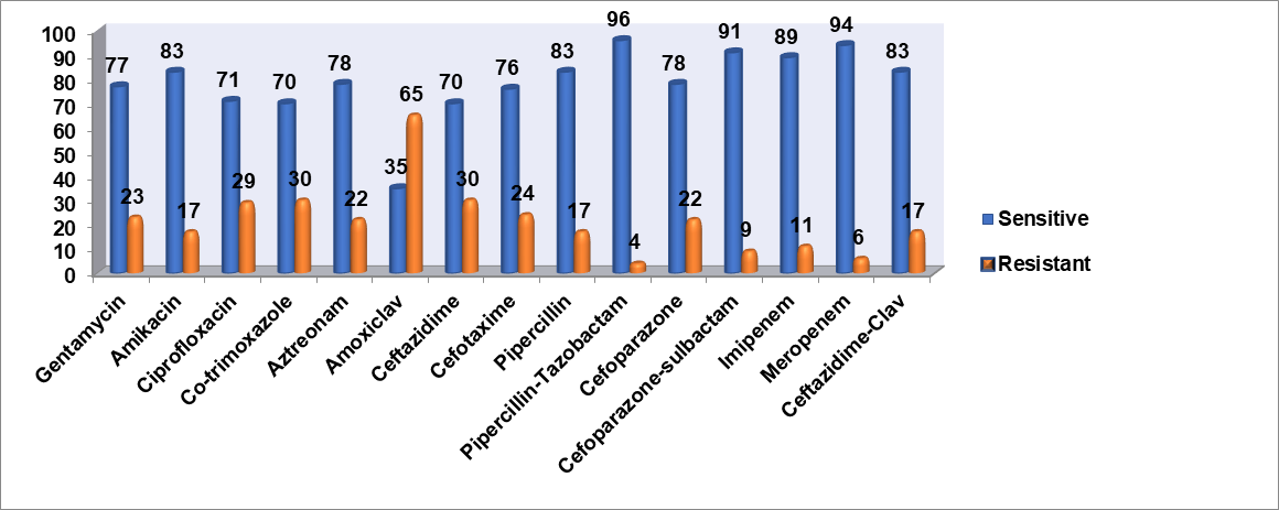 In our study, Escherichia coli showed 80% sensitivity to Amikacin and 20% sensitivity to ciprofloxacin. The sensitivity of Proteus mirabilis was good with Amikacin and Gentamicin. Klebsiella pneumoniae showed 85% sensitivity with Amikacin and 57% sensitivity with both Ciprofloxacin and Gentamicin. Among NFGNB isolates, 100% sensitivity was noted in Amikacin, Gentamycin, Ciprofloxacin, and Piperacillin-Tazobactam while 89% of isolates were sensitive to Piperacillin.
