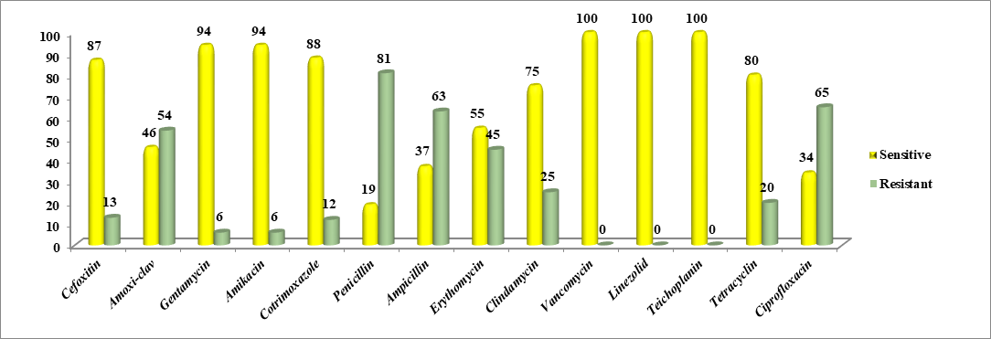 Fig. 8: Antibiotic sensitivity pattern of staphylococcus aureus (n=110)