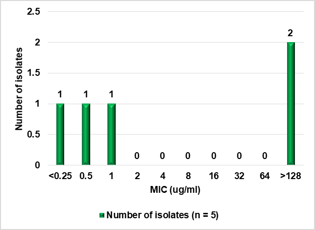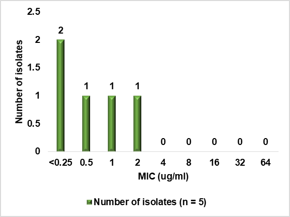 Peptostreptococcus showed 100% sensitivity to Metronidazole while Clindamycin was sensitive in 40% of isolates. Table 7, fig. 9 depicts the MIC range.