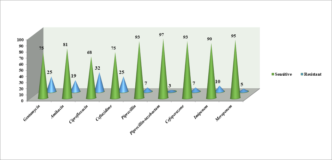 Fig. 7: Antibiotic sensitivity pattern of pseudomonas aeruginosa (n=200)