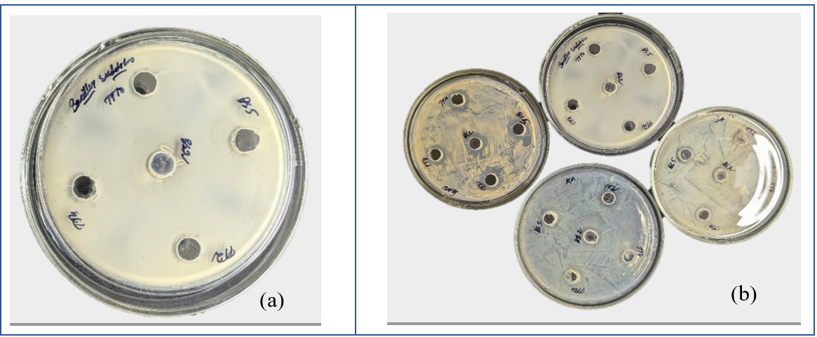 value 0.08-0.1 by adding fresh nutrient broth. After standardization, 100µl* of each sample was taken and spread over nutrient agar plates using a cotton swab. After spreading, 5 wells were made inside the agar plate by maintaining proper distance in between with the help of a sterile well borer. Each well was marked properly and poured with 50µl* LAB samples. Plates were kept in an incubator at 37 °C for 18-24 h. Antibacterial zones were measured using an antibiotic zone scale.
