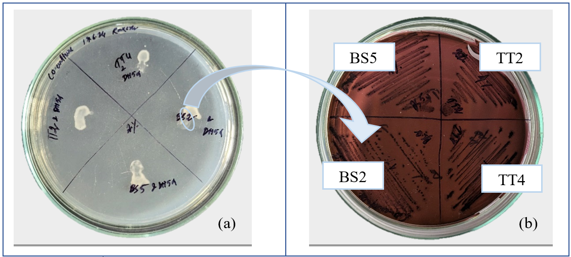 Selected bacterial isolates TT2, TT4, BS2, and BS5 were chosen and grown with Escherichia coli DH5α cells at different salt concentrations (2%,4%,6%). After growing them together a loopful culture was taken and grown in Eosin Methylene Blue (EMB) agar for pure culture isolation. No metallic shinning was found in the grown isolates on EMB agar, which indicates the absence of Escherichia coli (fig. 2).