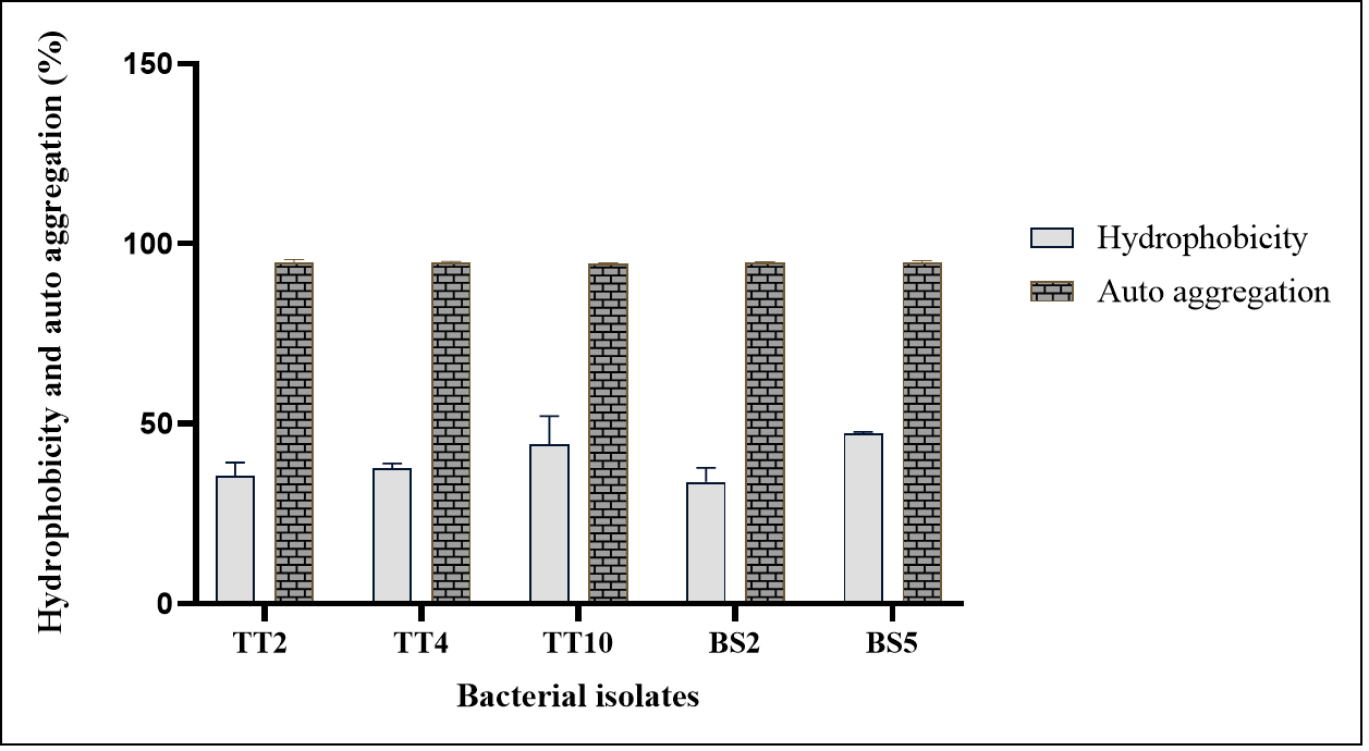 The cell surface hydrophobicity of these strains varied from 33.7-44.2%. TT10 exhibited higher surface hydrophobicity compared to others ~44.27%, whereas TT2, TT4, BS2, BS5 showed 35.37%, 37.725%, 33.75%, 36.64% respectively. The variation in hydrophobicity among the strains can be attributed to the diverse structural and chemical composition of bacterial surfaces, including unique hydrophobic amino acids, polysaccharides, and other cell surface components. All the selected bacterial isolates show almost similar percentages of auto-aggregation activity ~94% (fig. 3).