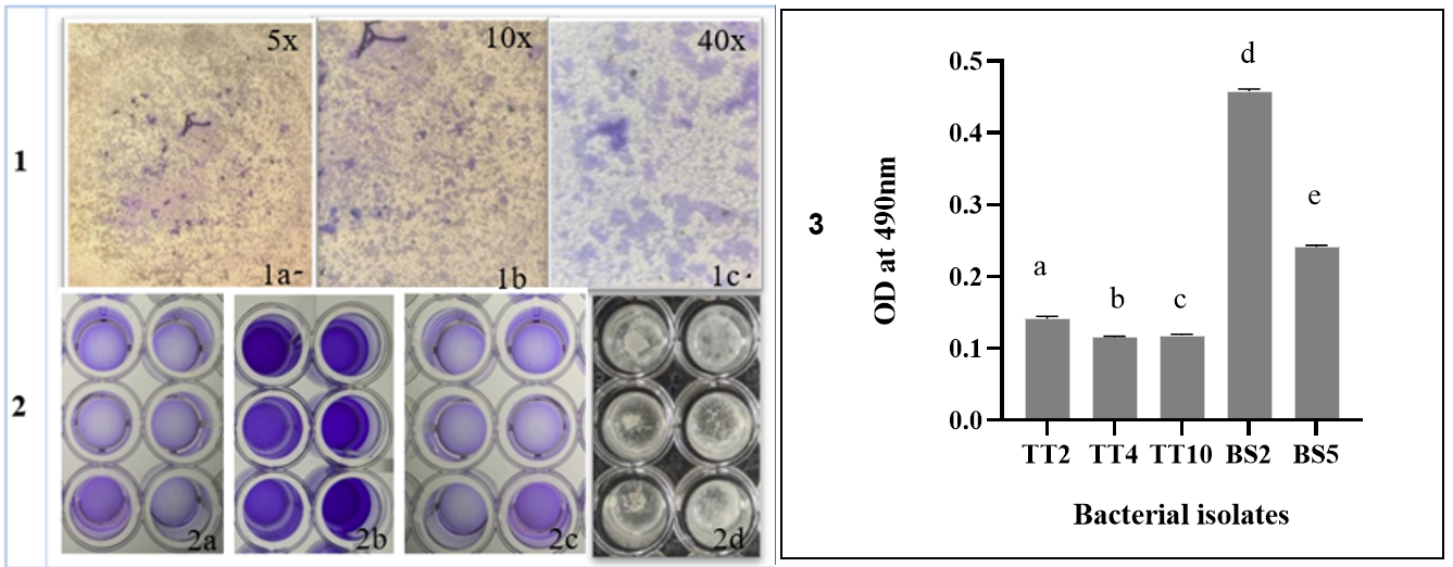 Fig. 4: Biofilm formation qualitative assay; 1a,1b,1c represent microscopic visualization of the biofilm, 2a represent positive control, 2b represents a sample, 2c represents negative control 96-well titer plate images, B4 represents the biofilm formation after incubation period without any treatment, 3 represent the optical density of the selected isolates at 490 nm for measuring biofilm formation (a-e show significant differences between each other). Bars show the mean of independent biological replicates±SEM, n =3. Statistical significance was determined using a one-way ANOVA test. A significant difference was found among means (P<0.05)