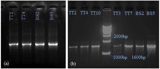 Fig. 5: (a) Genomic DNA visualization in Bio-Rad imaging software, (b) PCR amplified product of the 16S rRNA of the isolates from tungtap and lung-siej samples