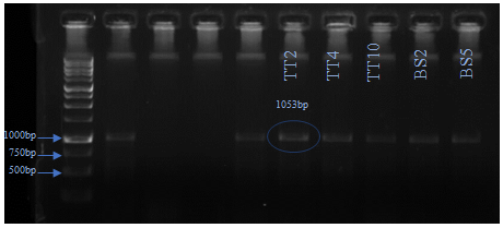 Polymerase chain reaction was done with the designed primers; same protocol was followed here, which was previously followed for 16S rRNA isolation. A clear band was found above 1000bp, around the 1053 base pair (fig. 7), which suggests the presence of PC1 β-lactamase in the tungtap isolates. This suggests the presence of the gene, but further purification and sequencing are required for confirmation.