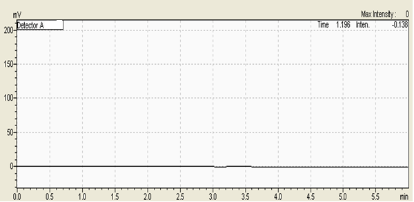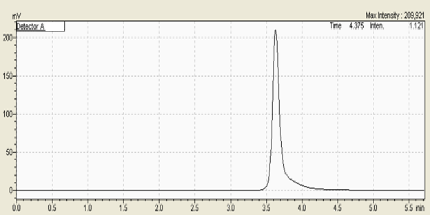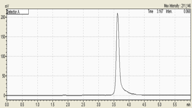 In order to test the applicability of the developed method to a commercial formulation, PLANEP was chromatographed at working concentration (30µg/ml) and it is shown in fig. 5. The sample peak was identified by comparing the retention time with the standard drug fig. 4. System suitability parameters were within the acceptance limits, ideal for the chromatographed sample. Integration of separated peak area was done and drug concentration was determined by using the peak area concentration relationship obtained in the standardization step. The protocol affords reproducible assay of the drug in the sample ranging between 98 and 102%, which is the standard level in any pharmaceutical quality control.