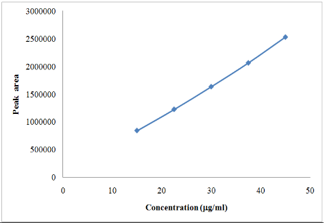 Standard solutions of Eplerenone at different concentrations level (50%, 75%, 100%, 125% and 150%) were prepared. Calibration curve was constructed by plotting the concentration level of drug versus the corresponding peak area. The results show an excellent correlation between peak area and concentration level of drug within the concentration range (15-45µg/ml) for the drug and the results are given in table 4 and fig. 6. The correlation coefficient of Eplerenone is 0.998 and hence the method is said to be linear.