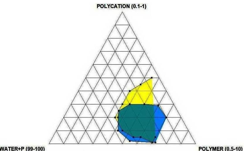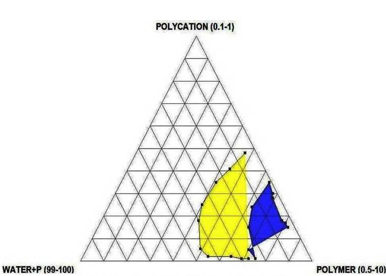 Partial ternary phase diagrams were constructed for (≤2% (w/v) of polymeric solution, anion and cation. The effect of cationic and anionic interaction that is feasible for the sol to gel transition was investigated. Polymers were dissolved in water & then, the appropriate amount of a 1% cationic & anionic solution was added in stoichiometry and left overnight to equilibrate. Formulations were assessed the following day in terms of their visual appearance and flow (by tilting the vial to an angle of 90ñ), and were classified as solutions, viscous solutions or gels.