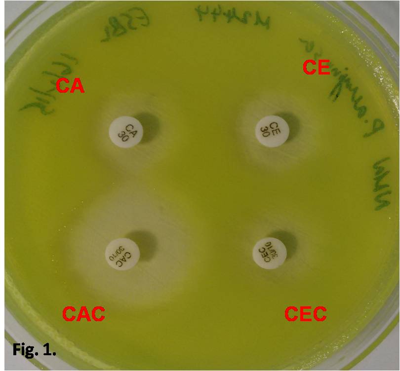 Fig. 1: ESBL confirmatory test-Double disk diffusion method. The inhibition zone around the CAC disk is apparently larger than around the CA disk, indicating ESBL production. But no comparable result is obtained with CEC disk and CE disk. Abbreviations: CA, Ceftazidime (30 µg); CAC, Ceftazidime+clavulanic acid (30/10 µg); CE, Cefotaxime (30 µg);CEC, Cefotaxime+Clavulanic acid (30/10 µg)